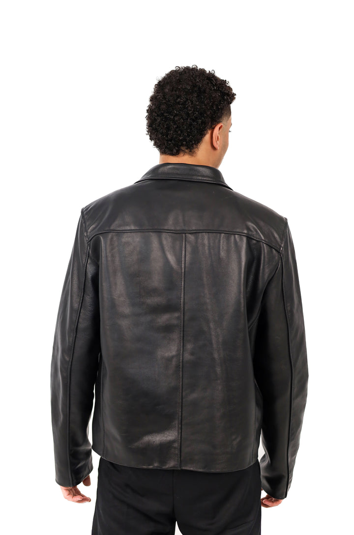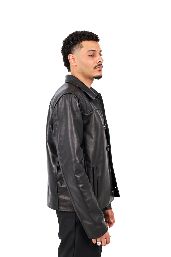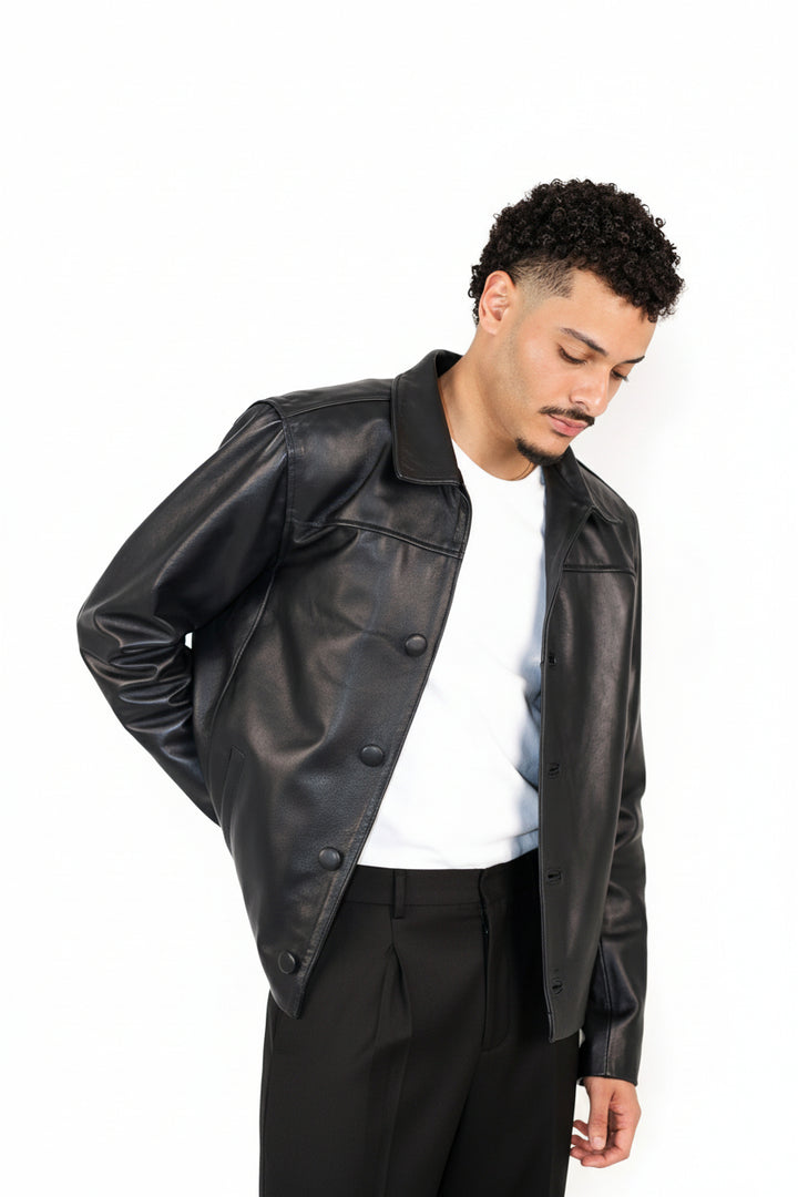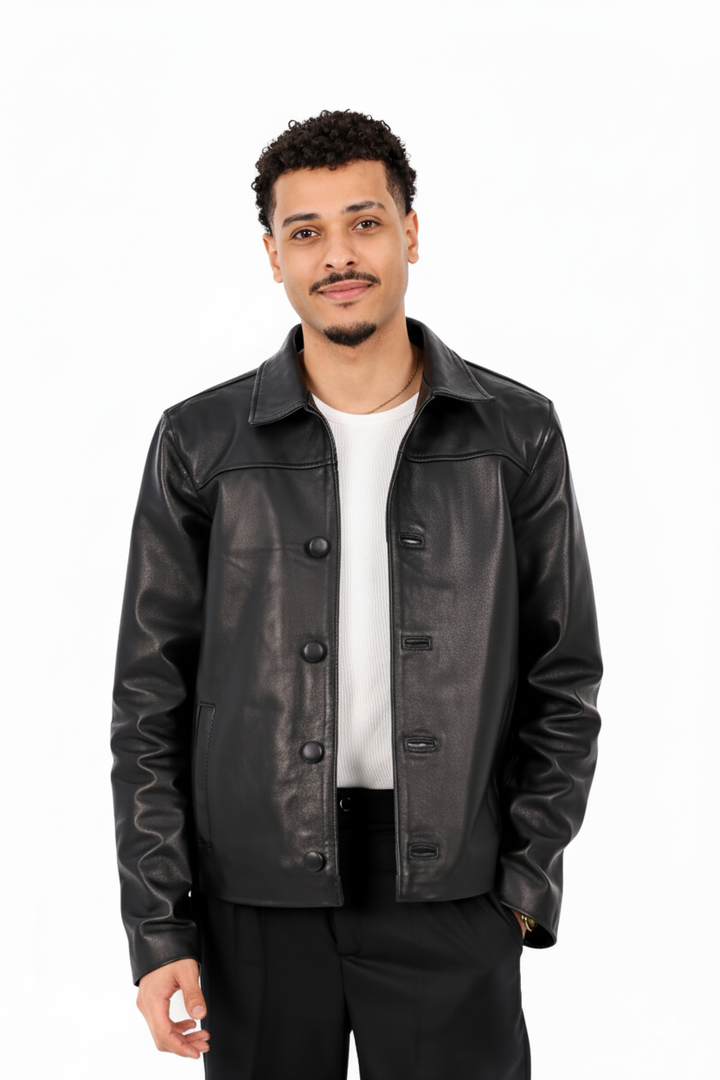 A clean and minimal 100% genuine sheep leather jacket designed with a classic button-up closure and straight-cut silhouette. The smooth leather finish, shirt-style collar, and simple design make it perfect for smart-casual and everyday outfits. Lightweight, soft, and comfortable — ideal for men who prefer a refined and timeless look