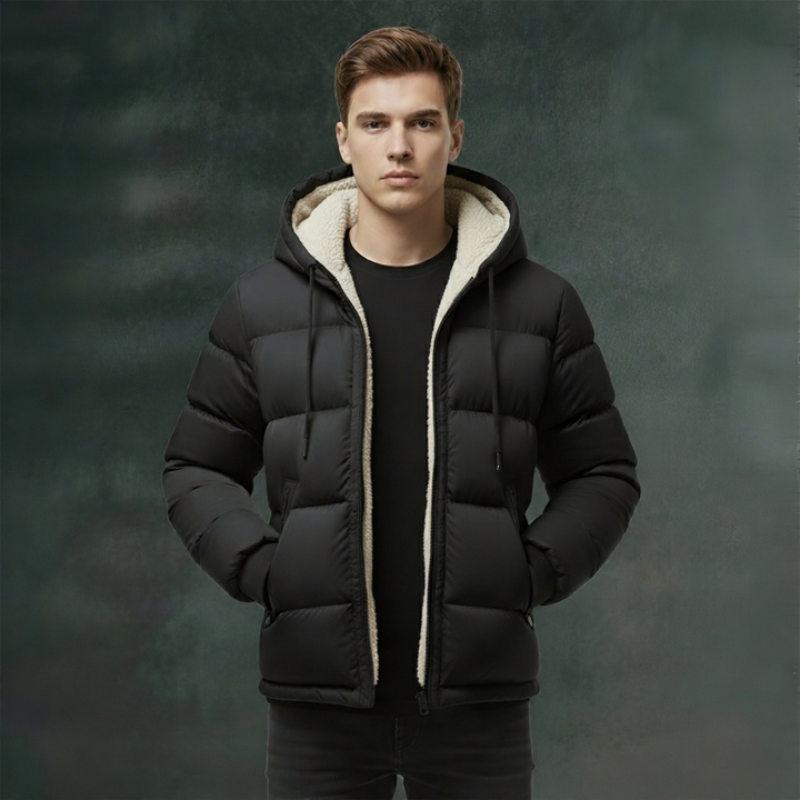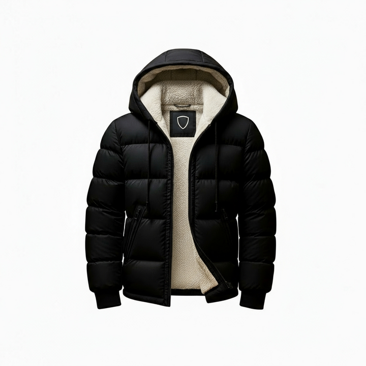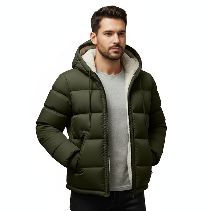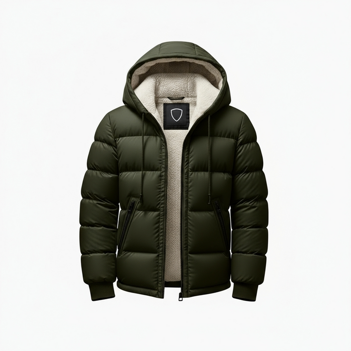 This puffer jacket with an attached hood is expertly crafted for exceptional warmth. Its quilted exterior and plush sherpa fleece lining extending through the body and hood ensure excellent insulation in chilly conditions. It features a full-length front zipper and zippered pockets for secure storage. Combining practical weather resistance with refined style, this jacket is an essential choice for reliable winter protection and everyday wear. Key Features: Superior Insulation: Sherpa fleece throughout. Design: Quilted hooded puffer style. Durability: Weather-resistant outer fabric.
